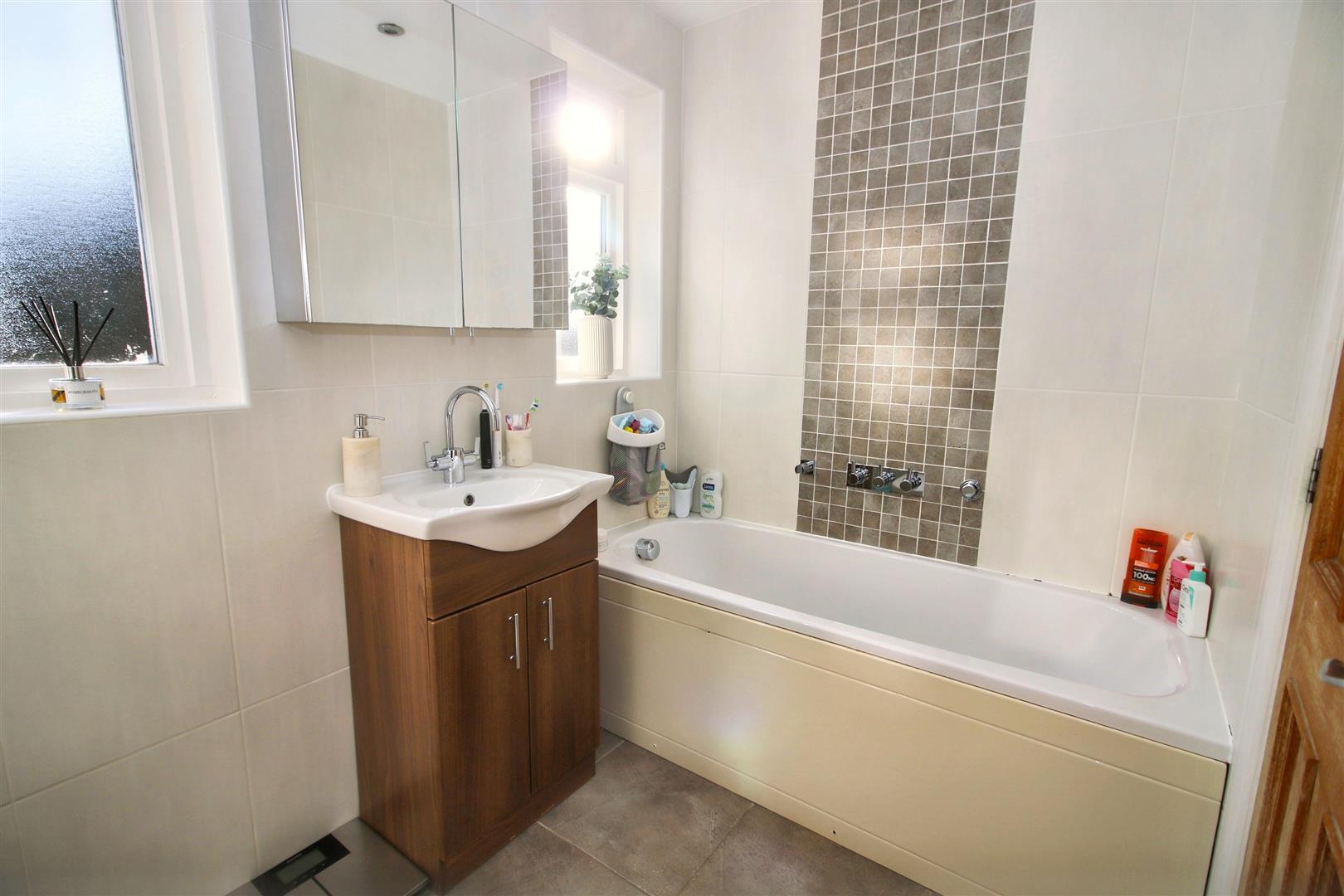 From the first-floor landing there is access to three good sized bedrooms, the master having space for a range of fitted wardrobes and one with an over-stairs cupboard. The fully-tiled family bathroom is stylishly fitted with a white suite including a separate shower, vanity unit with inset basin, bath and heated towel rail.